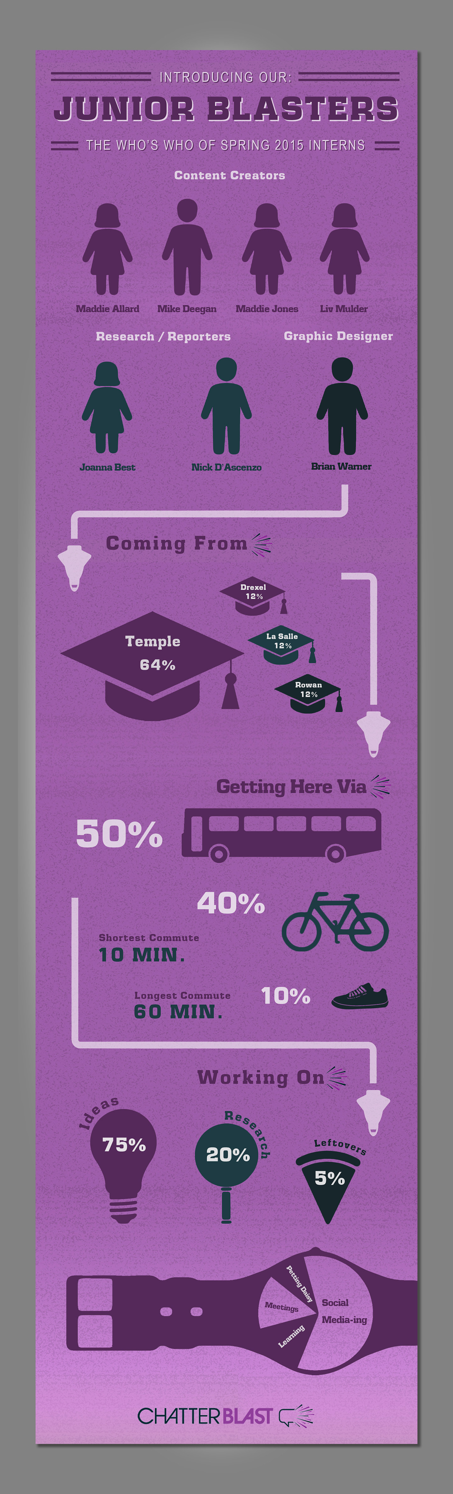 Originally published on the ChatterBlast blog, the "Interngraphic" infographic promoted the company to help find next semester's group of interns. It blended ChatterBlast's work world (with a branded color scheme, blast-off graphics, and rocket ships) with a collegiate style (simple, youthful graphics and a slab-serif typeface referencing higher education branding) to show the intern experience as the perfect bridge.