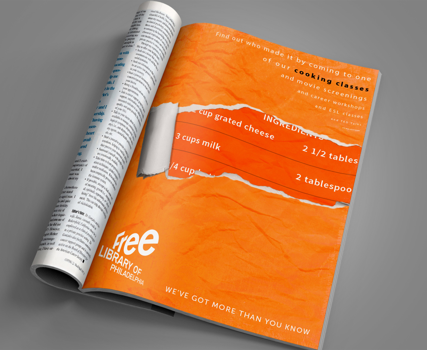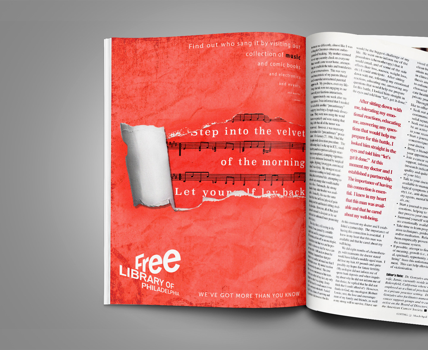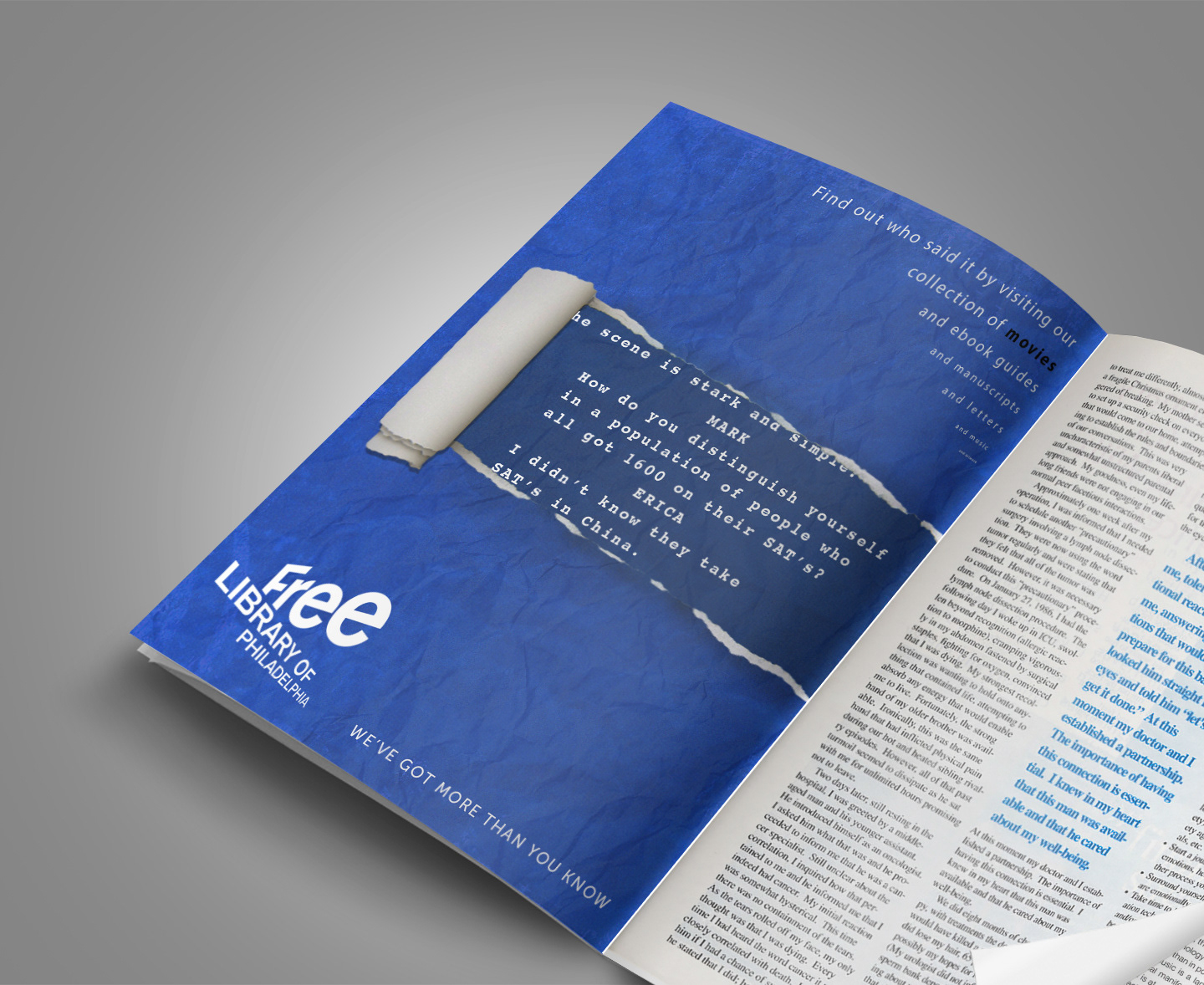 Shaking off the dusty book image libraries have, this campaign was shaped around people seeing the Free Library of Philadelphia instead as a source of different, stimulating varieties of media and events. By literally tearing back this old perception, viewers instead see a more vibrant color palette with quotes from media outside of books.